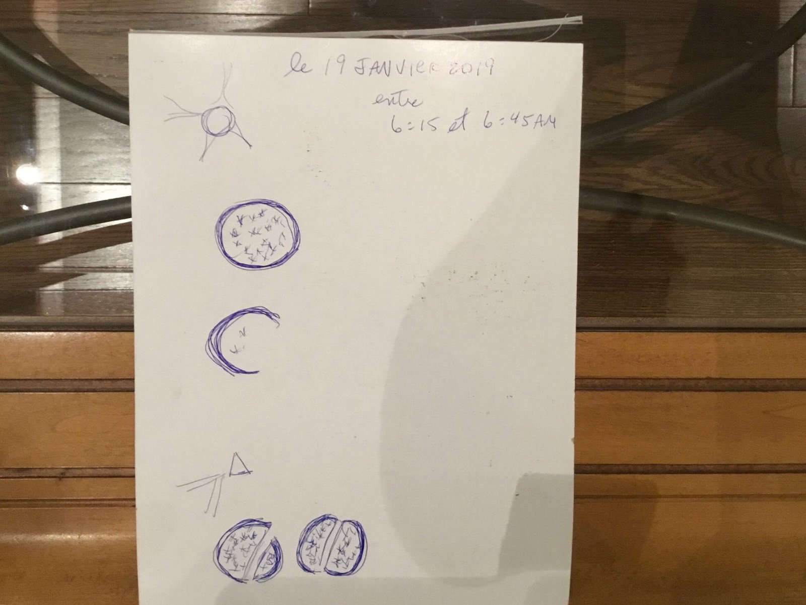 Les témoins ont également fourni un croquis des formes qu’ils ont aperçues à l’intérieur de la boule blanche. Bien que les détails de ce croquis ne soient pas spécifiés dans le rapport, il est mentionné qu’il illustre les caractéristiques observées par les témoins. L’événement s’est déroulé dans un contexte matinal, ce qui peut avoir influencé la visibilité et l’apparence de l’objet dans le ciel. Les conditions météorologiques au moment de l’observation n’ont pas été précisées, mais il est important de noter que le ciel était probablement dégagé pour permettre une observation claire.