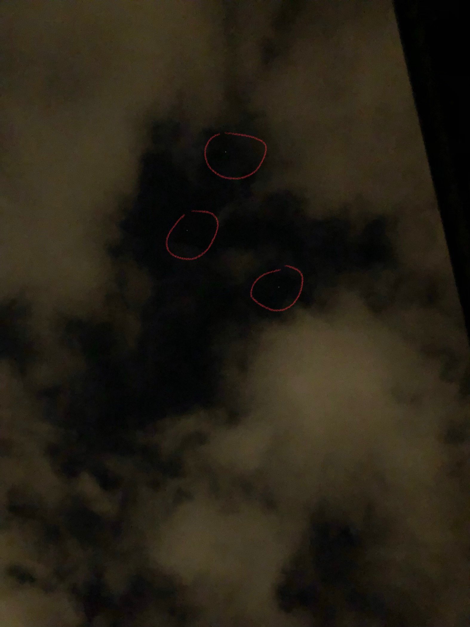 Le témoin a comptabilisé environ 30 boules lumineuses avant de contacter son frère, bien qu’il ait ressenti de la peur face à ce qu’il voyait. À la demande de son frère, il a décidé de retourner observer le phénomène et a aperçu encore une dizaine de sphères à des intervalles rapprochés. Certaines de ces sphères apparaissaient groupées par deux ou trois, ce qui a encore accru son incompréhension. Il a pris une photo d’une des boules qui avait descendu en altitude, mais a ensuite ressenti le besoin de se cacher, tant la situation lui paraissait troublante.