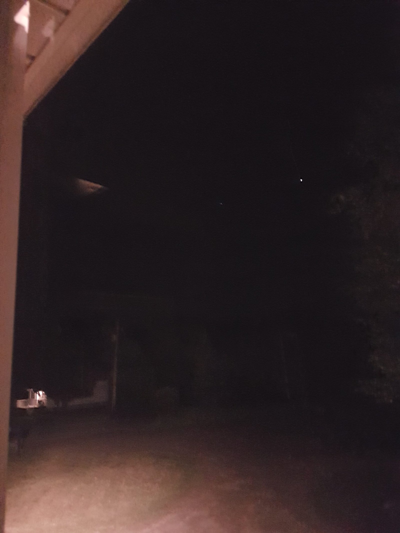 Il a tenté de les capturer avec sa caméra pendant environ une minute, mais l’écran montrait uniquement du noir, bien que les points émettent une forte lumière. En baissant la caméra au niveau d’une lumière extérieure faible, il a pu la voir clairement sur l’écran. Il a donc pris des photos à l’aveuglette, essayant de les aligner avec la maison du voisin. Peu après, un bruit fort de moteur a été entendu, suivi d’une lumière jaune et rouge volant à basse altitude, qu’il a supposé être un hélicoptère se dirigeant vers les objets triangulaires. Il a rapidement perdu de vue l’hélicoptère derrière les arbres, tandis que les lumières triangulaires restaient visibles, plus haut dans le ciel.