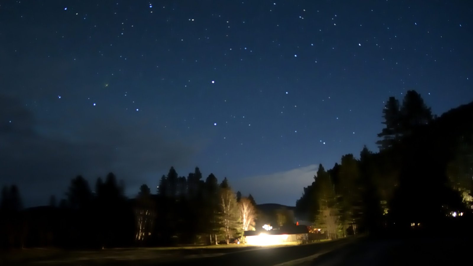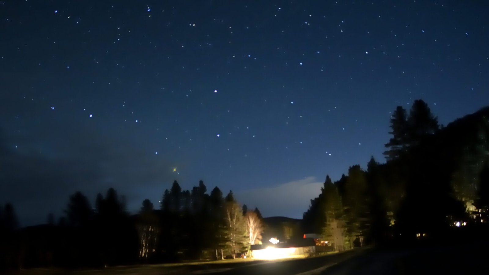 Deux photographies ont été prises lors de l’observation. La première image montre l’objet situé légèrement au-dessus du centre de la photo, positionné au-dessus d’un sapin vers la gauche. Sur cette photo, l’objet semble avoir des couleurs vives, notamment du jaune et du rouge, qui dominent l’image. La seconde photo, prise peu après, montre l’objet légèrement plus haut et plus petit, toujours vers la gauche. Cette image indique un changement de taille et de position, suggérant un mouvement de l’objet au cours de l’observation.