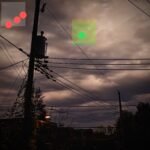 Il a cherché des images d’engins militaires avec des caractéristiques similaires, mais n’a trouvé aucune correspondance. Le témoin a décrit sa perception de l’objet : à bout de bras, son pouce couvrait la largeur de l’engin, qui se trouvait à environ 20 mètres à gauche d’un poteau électrique, tandis qu’un autre poteau se situait à environ 50 mètres à droite. L’objet, situé entre les fils électriques, semblait très proche, et il a pu couvrir les trois boules de feu avec son pouce. En tout, l’engin a été visible pendant environ sept secondes, se déplaçant du point vert à trois points orange avant de disparaître dans les nuages. Le nombre de témoins de cet événement est de un.