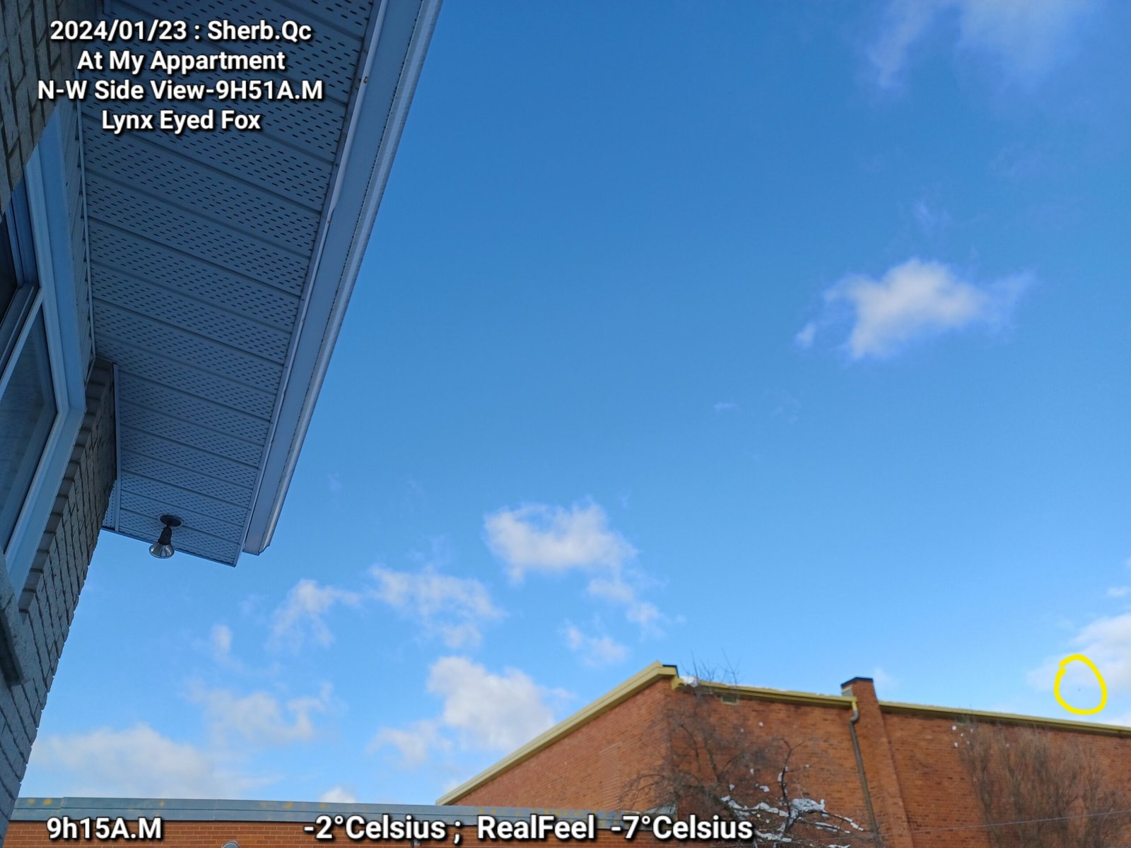 Le 23 janvier 2024, à 9h15, le témoin a observé un objet non identifié depuis le côté de sa maison. Alors qu’il fumait une cigarette, il a remarqué un phénomène étrange se produisant à l’ouest. L’objet est apparu de manière soudaine, donnant l’impression qu’il émergeait du ciel comme si celui-ci était une toile déchirée. Ce détail visuel a marqué le témoin, qui a décrit l’objet comme ayant une forme triangulaire, de couleur bleu foncé translucide, et de taille comparable à un cube de sucre.