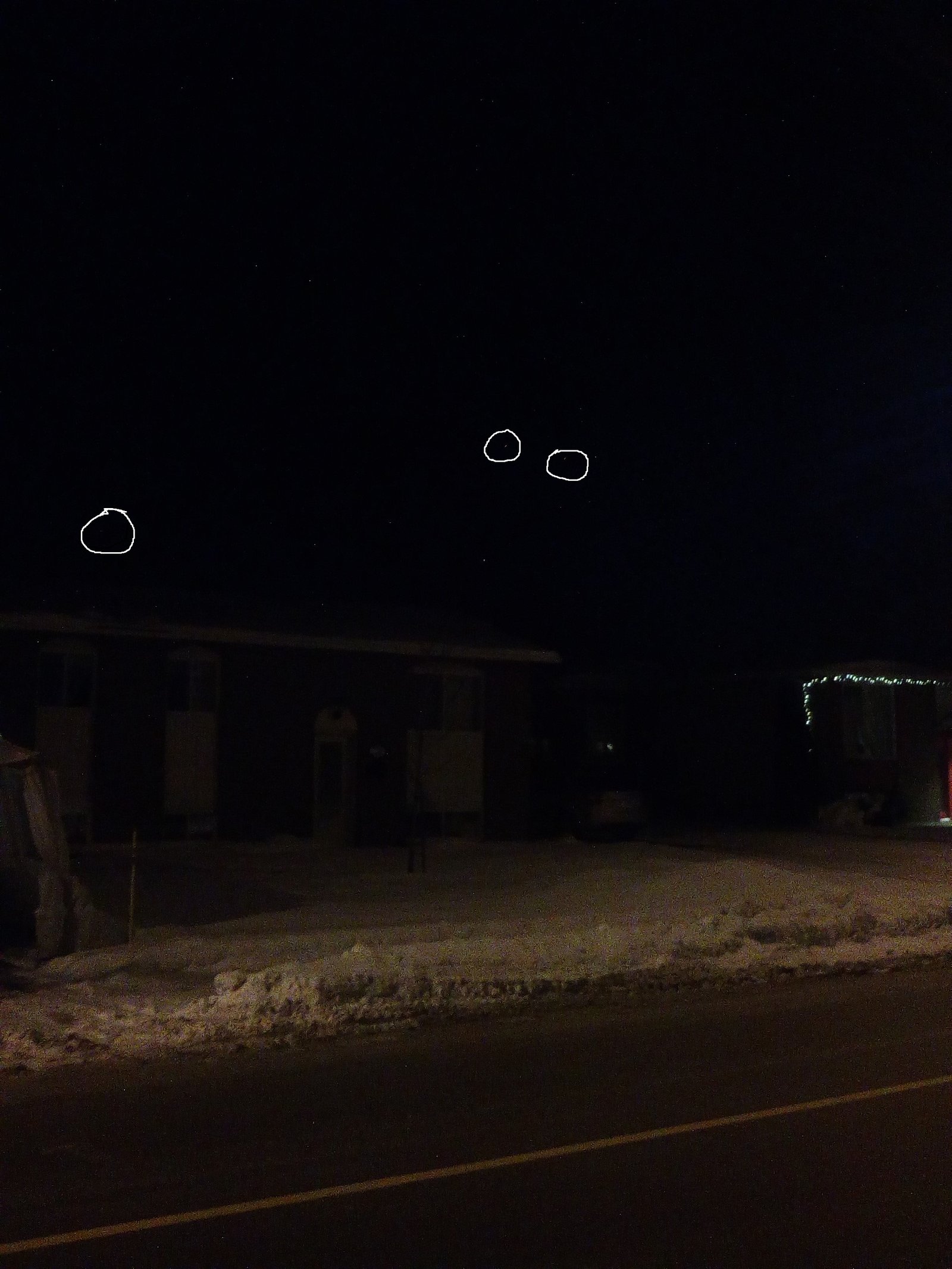L’objet était en formation triangulaire inversée, avec deux points lumineux en haut et un en bas. Les lumières étaient décrites comme orange jaunâtre. Fernand a tenté de capturer l’événement avec son téléphone, mais n’étant pas familier avec le fonctionnement de l’appareil, il a pris deux photos qui ne montrent rien de significatif. Peu après, la formation a cessé d’avancer et les trois lumières ont commencé à briller plus intensément, prenant une teinte blanche vive. Soudain, une lumière s’est déplacée vers la gauche, tandis que les deux autres ont filé vers la droite à grande vitesse.