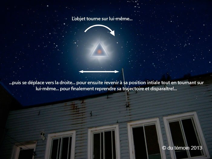 Le témoin a estimé que l’objet se trouvait à une altitude similaire à celle d’un avion de ligne. À ce moment-là, l’intensité lumineuse a diminué, permettant au témoin de distinguer la forme de l’objet, qui était triangulaire. L’objet a ensuite commencé à tourner sur lui-même dans le sens des aiguilles d’une montre. Le témoin a alors pensé que cela correspondait à des comportements d’OVNI qu’il avait vus dans des vidéos, mais qu’il n’avait jamais observés en vrai. L’objet a ensuite effectué un léger déplacement en angle droit vers la droite tout en continuant à tourner, renforçant l’idée pour le témoin qu’il s’agissait bien d’un OVNI.