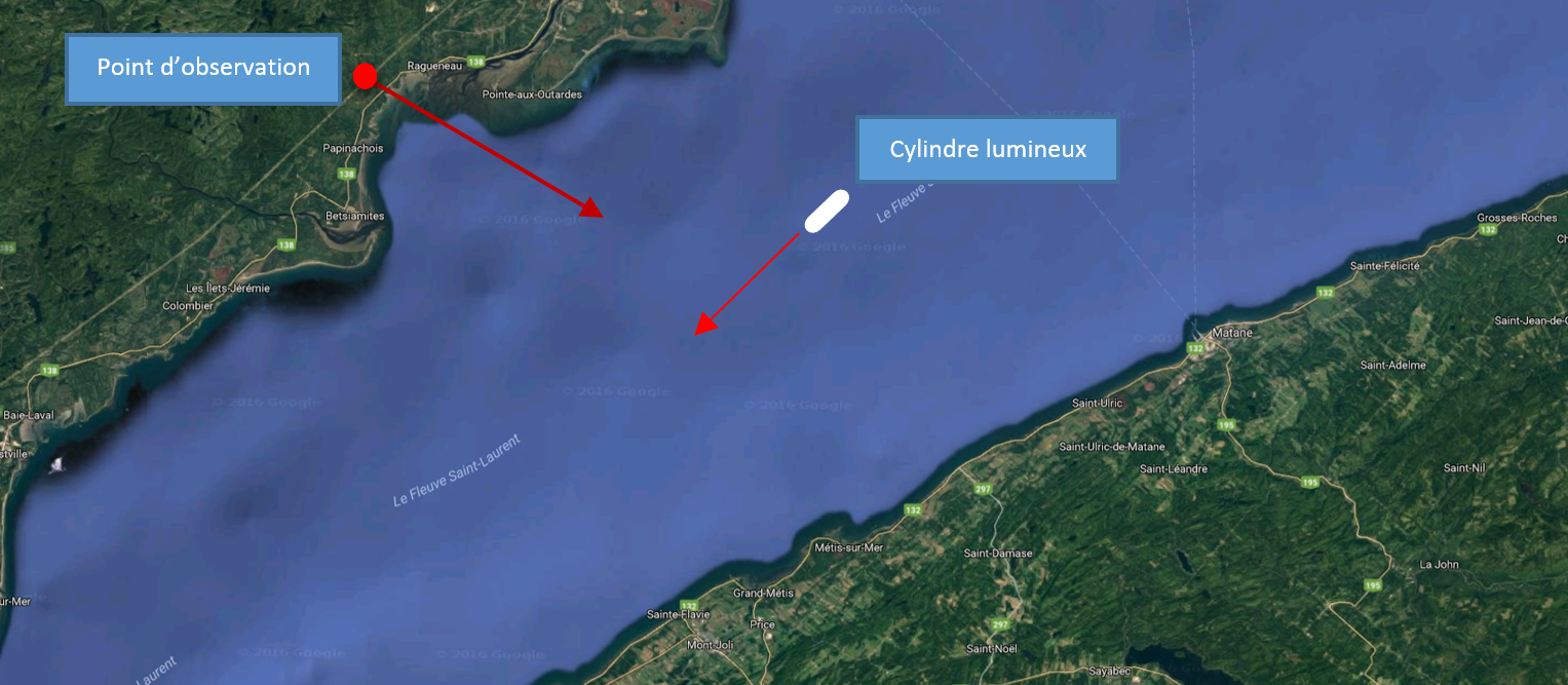 Après avoir constaté que l’objet restait immobile, le groupe a décidé de se déplacer vers la plage de Pessamit pour obtenir un meilleur point de vue. Le trajet a duré environ 10 minutes. Cependant, à leur arrivée sur la plage, ils ont constaté que la lumière cylindrique blanche avait disparu. L’observation s’est donc terminée aux alentours de 21h25. Les coordonnées géographiques du lieu de l’observation sont 49°03’17.4″N 68°37’47.5″W. L’objet était décrit comme ayant une forme de cigare, de couleur blanche, se déplaçant à une vitesse approximative de 10 km/h et à une distance d’environ 300 mètres de la rive. Quatre témoins ont assisté à cet événement.