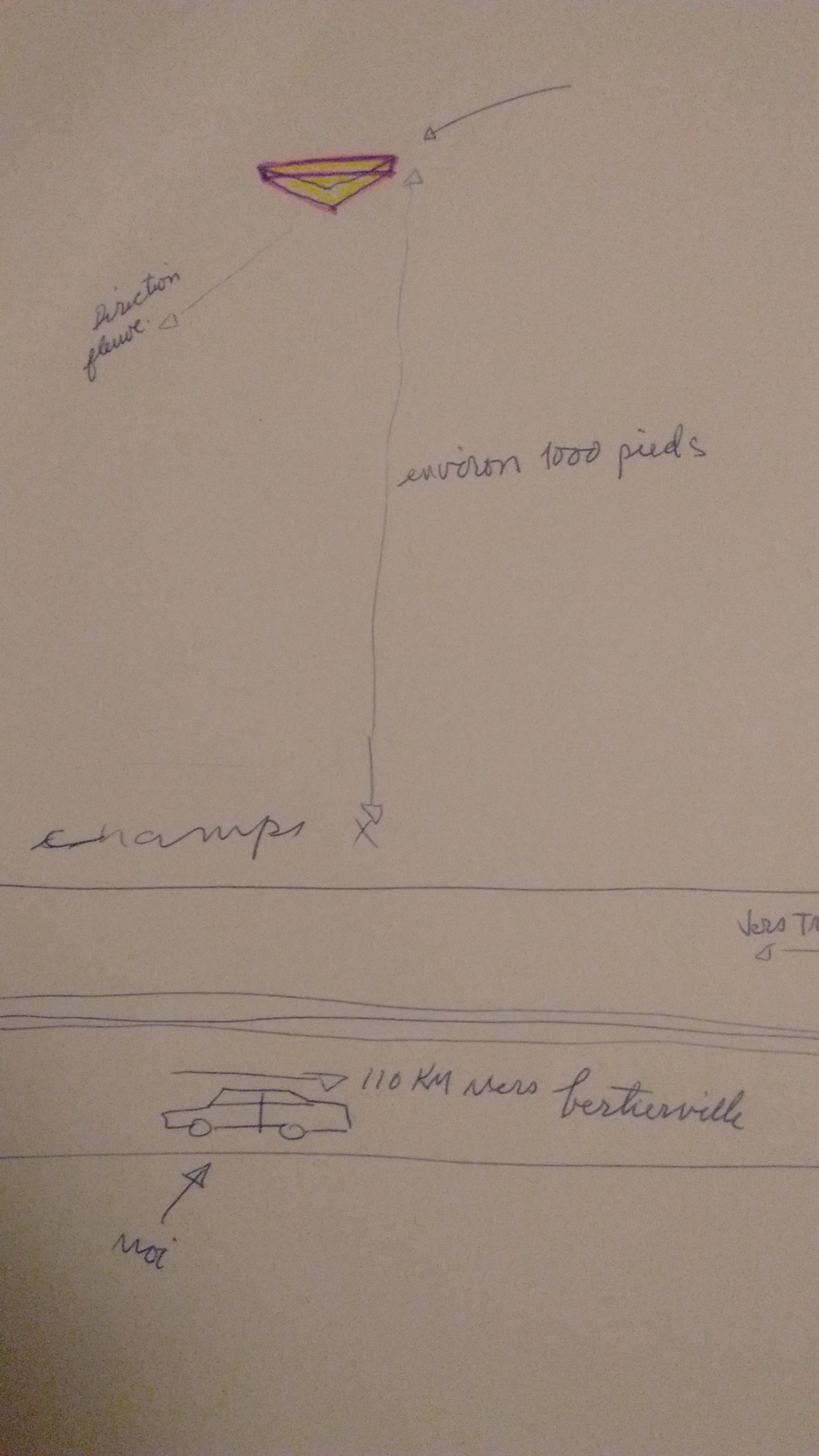 La formation des triangles était telle qu’ils évoquaient un morceau de gâteau, et leur mouvement semblait dirigé vers le fleuve. La hauteur à laquelle ces objets volaient était estimée à environ 1000 pieds, mais le témoin a précisé qu’il était impossible de donner une mesure exacte. Cet événement a été observé par trois personnes à l’intérieur du véhicule, toutes partageant la même expérience visuelle. L’observation a duré quelques instants, laissant une impression durable sur les témoins, qui ont continué leur trajet en se questionnant sur ce qu’ils venaient de voir.