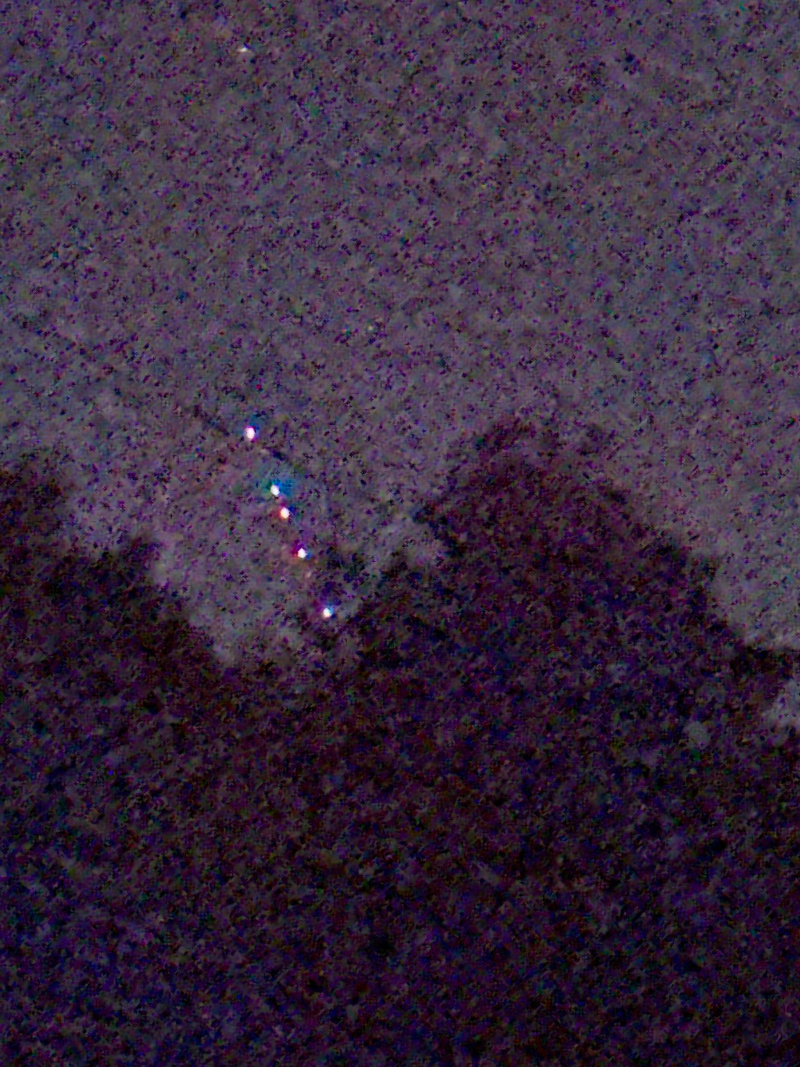 L’observation a eu lieu dans un environnement dégagé, permettant une visibilité optimale des objets. Le témoin a noté que les points lumineux étaient parfaitement alignés, sans variation de couleur ni clignotement, ce qui a suscité un certain étonnement. Les objets semblaient se déplacer lentement, mais le témoin n’a pas pu déterminer leur altitude ou leur distance exacte.
