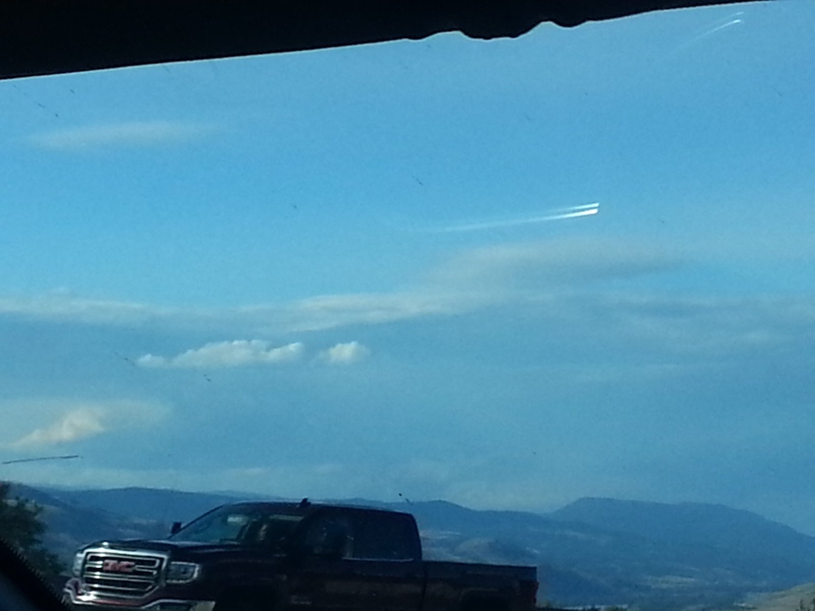 Ce qui a retenu notre attention, c’est que ces trainées semblaient émaner d’un point d’origine plat, suggérant la présence d’un objet qui n’était pas visible sur la photo. À notre point de vue, il n’y avait aucun avion dans le ciel à ce moment-là, ce qui a suscité une certaine perplexité. Nous étions situés à environ 15 km au sud de Kamloops, et l’environnement était dégagé, ce qui aurait normalement permis de voir des aéronefs si ceux-ci avaient effectivement généré ces trainées.
